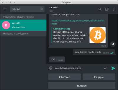 После отправки команды появятся кнопки с названиями валют. Максимум можно создать 6 кнопок, то есть 6 валют — 'rate,bitcoin,ripple,zcash,dash,monero,rub'