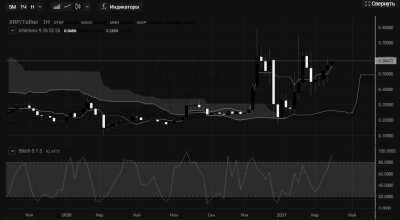 На недельках XRP выскочила над Тенкан и Киджун. Более того, Тенкан пересекла Киджун снизу вверх, и это пересечение направлено от облака, что является сильным сигналом на покупку. Так что монета растет, и возможно преодолеет сопротивление на 0.7.
