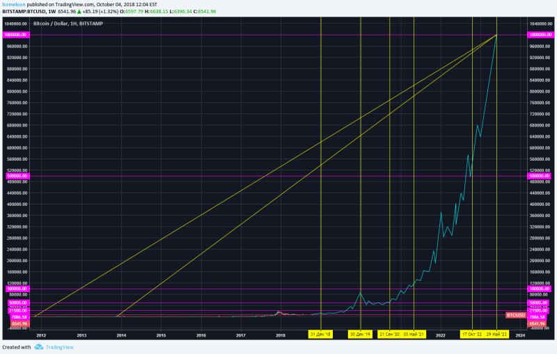 Попытался спрогнозировать рост btcusd до 1 млн. долл. Вышла еще та гипербола. Но стоило переключиться на логарифмический график и идея перестала быть фантастической.