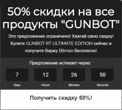 Внимание! Новогодние скидки! 50% скидка на все продукты "GUNBOT". Предложение действительно до 2 января! Успейте приобрести GUNBOT RT ULTIMATE EDITION и получите биржу Bitmex бесплатно! Счастливых праздников!