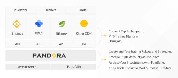 i-PANDORA После 8 месяцев трудов, мы запустили первый продукт - торговля на топ крипто биржах (Binance, Kraken, Poloneix, KuCoin и другие) через MetaTrader 5, посредством API. Мы приобрели лицензию MetaQuotes на использование терминала MetaTrader и совместно с разработчиками MQ создали шлюз для торговли. Каждые 2-3 недели мы подключаем новые известные, ликвидные криптобиржи, добавляем новые функции в MT и на сайте.