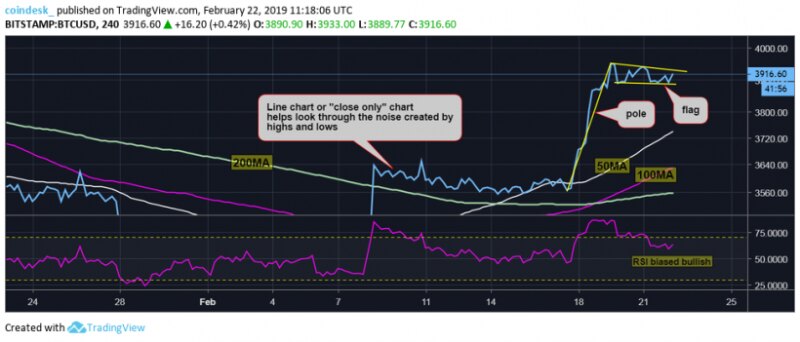 Аналитик CoinDesk Markets Омкар Годбоул убежден, что восходящий тренд и незначительные объемы торгов (разве?) говорят в пользу того, что консолидация на рынке завершится новой попыткой покорить уровень выше $4200. В пользу этого сценария говорит и бычий флаг на 4-часовом графике. Годбоул отмечает, что прорыв выше $3930 подтвердит формирование бычьего флага — для этого необходимо, чтобы четырехчасовая свеча закрылась над этим уровнем. Тогда быки смогут целиться в $4330. Индикатор RSI не демонстрирует перекупленности, как это было несколько дней назад, что подкрепляет силы покупателей. При этом в понедельник цена вышла из треугольника в районе $3750 и все еще держится над этим уровнем. Пересечение экспоненциальных скользящих средних с параметрами 5 и 10 на трехдневном графике говорит о том, что на рынке преобладают позитивные настроения. Однако, если быкам снова не удастся взять отметку в $4000, то возможно падение к 100-дневной скользящей средней на уровне $3,782. Падение ниже $3614 полностью отменит смену тренда на бычий. По состоянию на 13:10 UTC, биткоин торгуется в районе $3935 на Bitstamp. Добавим, во вторник, 19 февраля, на Чикагской товарной бирже (CME) был зафиксирован рекордный объем торгуемых фьючерсов на биткоин — более 18 тысяч.