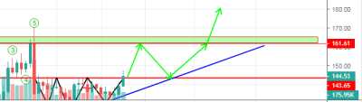 Ожидаю, что после достижения 160 произойдет откат обратно к линии восходящего треугольника в район 143-144 и уже с этих отметок цена пойдёт пробивать сильный уровень 160 с потенциалом вплоть до 235 в рамках 3-й волны восходящего импульса.