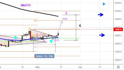 Кстати, обратил внимание, что по биткойну очень просто считать торговые дни, т.к. они всегда совпадают с календарными:). Итак, трудно делать какие-то выводы, когда цена за 16 торговых сессий не сдвинулась ни на миллиметр. И -это на таком волатильном активе! Но, всё-же, какие-то намёки на то, что могло случиться дальше, заметить было реально. Я говорю тут о точных отскоках от ЕМА50(жирная синияя). Теперь же, оглядываясь назад, уже понятно, что уровень 4000 служил важным психологическим сопротивлением. И, если продолжить эту мысль и руководствоваться той же логикой, можно предположить, что цена двинулась к следующему психологическому уровню 5000. К такому развитию событий её подталкивают следующие факторы: расположение МА200(жирная чёрная), Точки Пивот R2 и R3 и глубина пробитого конечного клина(чёрный шестёрки). А толчок к такому сценарию, дал маленький равностороний треугольник, который, по определению, является паттерном продолжения тренда.