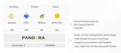 Трейдинг через MetaTrader5: Binance, Poloneix, KuCoin, Okex, Kraken и другие i-PANDORA После 8 месяцев трудов, мы запустили первый продукт - торговля на топ крипто биржах (Binance, Kraken, Poloneix, KuCoin и другие) через MetaTrader 5, посредством API. Мы приобрели лицензию MetaQuotes на использование терминала MetaTrader и совместно с разработчиками MQ создали шлюз для торговли. Каждые 2-3 недели мы подключаем новые известные, ликвидные криптобиржи, добавляем новые функции в MT и на сайте. Наше решение позволяет не только использовать много бирж, но и быстро переключаться между ними, а так же использовать торговые роботы, собственные торговые системы и индикаторы, написанные в MQL. Торговые роботы для MetaTrader. Самый лучший вариант это переделать существующий робот с Forex под крипто-биржи, и используя сервис i-Pandora вы легко устанавливаете прибыльный торговый робот в торговый терминал MetaTrader 5, который подключён посредствам API к вашей криптовалютной бирже, настраиваете, после чего "советник" начинает вести торговлю по запрограммированной в нём стратегии, в онлайн режиме круглосуточно. Торговые сигналы в MetaTrader. Копируйте сделки успешных трейдеров или транслируйте свои сигналы. Прямо внутри платформ MetaTrader вам доступны торговые сигналы (копи-трейдинг) — сервис автоматического копирования сделок с одного счета на другой. Принцип его работы прост: один трейдер открывает доступ к своим операциям на финансовых рынках — другие подписываются на него. В результате все сделки провайдера автоматически повторяются на торговых счетах подписчиков. PANDFOLIO - это аналитический сервис, который позволяет трейдерам мониторить, анализировать, управлять и отслеживать прибыль/убыток своих счетов/портфелей в одном месте. При добавлении в личный кабинет API криптобирж вы можете наблюдать за статистикой всех своих монет в автоматическом режиме. Формирование статистики/истории всех торгов/ввода и вывода монет с биржи, через загрузку CSV файла на наш сервис. Скоро будет запущено мобильное приложение для Android и iOS для удобного отслеживания своего криптопортфеля, и виджет для Apple Watch. PANDORA TODAY - Это информационно аналитический портал. В котором мы совместили Twitter агрегатор лиц влияния в криптосообществе, twitter от создателей криптовалют и ICO проектов, twitter от криптобирж и новостных источников о криптовалютах. Уникальность портала состоит в том, что при активации аккаунта на Pandora и добавлении API биржи, на портале pandora.today Вам будет предлагаться информация и аналитика согласно монетам, находящимся в Вашем крипто портфеле. Удобный фильтр позволит настроить поток новостей согласно Вашему пожеланию. В разделе Аналитика, Вам будет предоставлена аналитическая информация о криптовалютах. Идеи самых читаемых и популярных трейдеров на сервисе TradingView, вся информация подбирается под Ваш криптопортфель. В перспективе, у нас будет много интересных и эффективных продуктов для трейдеров и инвесторов, над которыми мы сейчас работаем, и которые помогут в сфере криптовалют. Зарегистрировавшись однажды на нашем сервисе Pandora, Вы получите все, что вам нужно для трейдинга в одном месте. Ссылки: i-pandora торговля через MetaTrader 5 pandfolio.com контроль и анализ криптопортфеля pandora.today twitter агрегатор и аналитика крипторынка Facebook Twitter Telegram