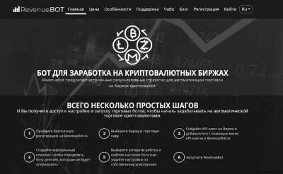 RevenueBOT - облачный трейд бот для торговли на топовых криптобиржах. Стоимость бота - 20% от прибыли, но не более 50 USD в BTC эквиваленте за календарный месяц. Что это? - RevenueBot - программное обеспечение, предназначенное для автоматической торговли на криптовалютных биржах с использованием API интерфейса. - Работа бота основана на использовании волатильности курсов крипто монет. Бот может торговать в любой паре крипто монет доступной на выбранной бирже. - Можно запустить одновременно несколько ботов и таким образом торговать сразу несколько пар крипто монет одновременно на одной или на разных крипто биржах. - Бот работает из "облака" круглосуточно, нет необходимости устанавливать программное обеспечение на свой компьютер и оставлять его включенным чтобы бот не прерывал работу. - Бот работает полностью автоматически, но его нужно настроить. Наш сервис не навязывает какие-то конкретные настройки и не предлагает услуги доверительного управления криптовалютами и финансами. - Мы можем порекомендовать успешные стратегии в виде шаблонных настроек бота, но как будет работать бот решаете Вы. Для этого наш сервис предоставляет удобные интерфейсы для доступа ко всем возможным настройкам бота, а также полную статистику по торговле и доходу. Сколько стоит? - У нас нет абонентской платы и комиссии за сделки на криптобиржах. Мы берем комиссию 20% только с прибыли, которую Вы получаете при торговле ботом, но не больше чем 50 USD в BTC эквиваленте за календарный месяц. Вам не нужно тратить свои деньги, чтобы пользоваться нашим ботом! - При каждом получении прибыли ботом списывается комиссия с баланса аккаунта. Каждая транзакция отображается на странице профиля. Для первого запуска бота в работу пополнять баланс необязательно, но как только вы получите прибыль, ваш баланс станет отрицательным на сумму 20% от полученной прибыли. Эту сумму необходимо погасить в течение 3 дней по избежании блокировки аккаунта и принудительной остановки ботов. Используя API интерфейс бирж бот следуя выбранному алгоритму оперирует выствлением ордеров и отслеживанием их выполнения. На данный момент существует два алгоритма работы бота RevenueBot СВЯЗАННЫЕ БИРЖИ: Как работает? 1 ) Алгоритм Long Работа бота происходит циклами и основана на принципе покупай дешевле при падении курса (начальная часть цикла) и продай дороже при росте курса (финальная часть цикла). Идея заключается в том, что имея определенный депозит бот покупает не на всю сумму сразу, а частями когда цена падает, используя для этого рассчитанную заранее сетку ордеров. Первый ордер в сетке самый близкий к текущей цене и самый маленький по обьему. Каждый последующий ордер объемней (используется система мартингейл) и дешевле. Таким образом при падении цены бот покупает все больше и больше но за меньшую цену, что позволяет совершить итоговую прибыльную сделку, продав все купленное по цене гораздо ниже чем бот начинал покупать. По выполнению такой сделки получаем прибыль, бот все подсчитывает и начинает новый цикл работы. Профит получается во второй монете торгуемой пары. Успешность такой торговли определяется количеством ордеров в сетке, разницей в их весах, расстоянием между друг другом, отступом первого ордера и как глубоко от текущей цены будет отстоять последний ордер в сетке. 2) Алгоритм Short Принцип работы такой-же как у ал