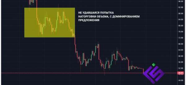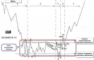 Модель Ричарда Вайкоффа позволяет спрогнозировать дальнейшее движение при наступлении дисбаланса между спросом и предложением и дальнейшей расторговке рынка вниз (слив), или выходом вверх (набор позиций). Рассмотрим случай наторговки объема. модель Вайкоффа Далее по пунктам: 1 — PS (Preliminary Support) — Появляются покупки, рост объема говорит о возможном «нащупывании» дна 2 — SC (Selling Climax) — Продавцы на издыхании, продажи толпы съедаются покупками больших игроков 3 — AR (Automatic Rally) — Почти никакого давления продавцов, волна позволяет определить один из верхних уровней торгового диапазона 4,7 — SC (Secondary Test(s)) — Большие игроки ретестят на вероятность дальнейших продаж, если дно подтвердилось, больших предложений больше быть не должно. 6 — Creek — Волновое сопротивление, пробитие которого будет сигналить нам о готовности рынка выйти вверх 8 — Springs or Shakeouts — Последний тест на предложение, пробитие поддержки считается нормальным при низких объемах и означает что нам открыли двери сверху. Большие объем — опасно. Средние — ждать еще тестов. 10 — JAC (Jump across the Creek) — Долгожданный волнообразного сопротивления 11, 13 — SOS (Sign of Strength) — Появление признаков силы, при пробое на хорошем спреде и объеме 12, 14 — LPS (Back up to Last Point of Support) — Откат к поддержке, бывшим уровням сопротивления. Идеальная зона для входа в лонг или прибавке к позиции. Вот как это может работать применительно к крипте.