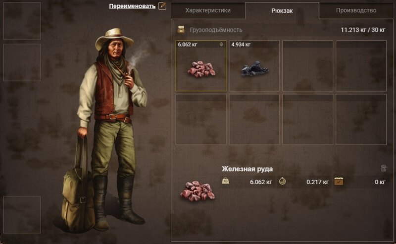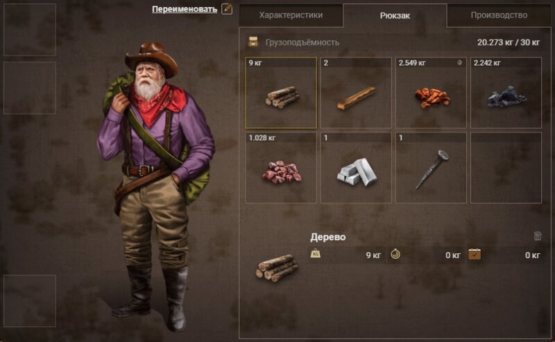 После регистрации в игре нас будут ждать трое работников, каждый из них может добывать ресурсы, создавать инструменты и переносить 30 кг.