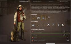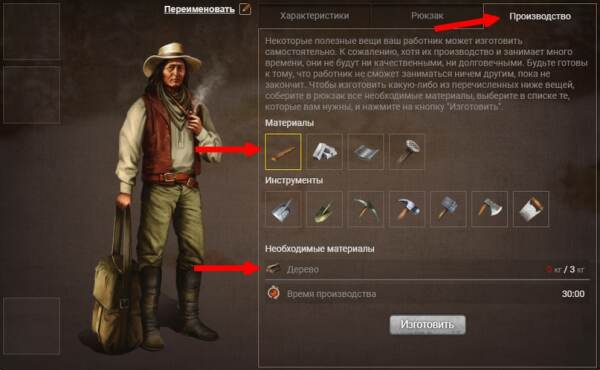 Нажимаем на любого свободного персонажа и открываем окно «Производство», видим все доступные нам материалы, которые можно создать.