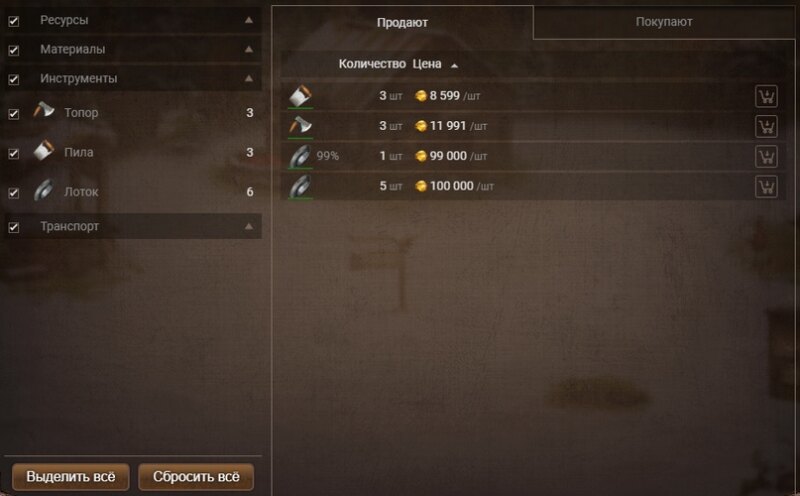 Ресурсы имеют самую низкую стоимость, материалы и инструменты будут стоить намного дороже. Не стоит спешить продавать по заявке покупателя, Вы можете выставить свои вещи на продажу по своей цене и просто ждать пока их купит другой игрок.
