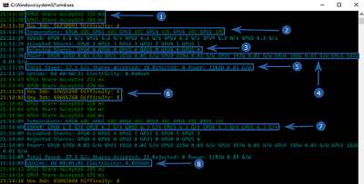 После того, как вы настроили файл .bat можно запускать GMiner, кликнув на сконфигурированный вами файл с выбранной криптовалютой. Если вы всё сделали правильно, то дальше открывается консоль майнера. Стоит разобраться в том, что мы можем узнать из отображаемых там данных.