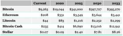 Команда аналитиков из Crypto Research Report привела таблицу предполагаемого изменения цен на биткоин, Ethereum, Litecoin (LTC), Bitcoin Cash (BCH) и Stellar (XLM) до 2033 года.