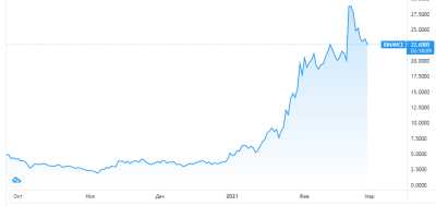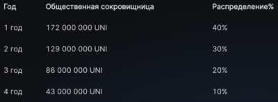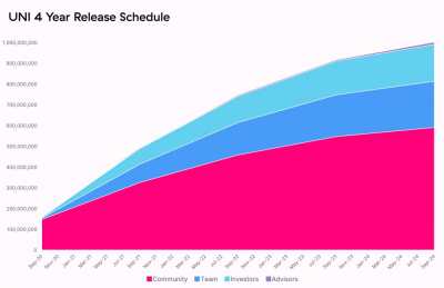 Uniswap, UNI — токен децентрализованной биржи Uniswap. Особенность биржи (протокола) Uniswap в том, что для обменных операций ERC20-токенов не нужна регистрация. В качестве токена управления UNI дает держателям право голоса в том, как работает протокол, предоставляя им непосредственное владение управлением Uniswap, казначейством сообщества UNI, переключением платы за протокол, eth ENS, списком по умолчанию Uniswap (tokens.uniswap.eth) и токены ликвидности SOCKS. Эмиссия UNI: 1 миллиард UNI (станет доступен в течении 4 лет). Первоначальное распределение: 60.00% членам сообщества Uniswap 600,000,000 UNI 21,51% членам команды и будущим сотрудникам с 4-летним переходом 215,101,000 UNI 17,80% инвесторам с переходом на 4 года 178,000,000 UNI 0,069% советникам с 4-летним переходом 6,899,000 UNI Инфляция: 2% в год, начнется через 4 года (что обеспечит постоянное участие и вклад в Uniswap за счет пассивных держателей UNI). Поскольку 15 % токенов уже доступны для использования историческими пользователями и поставщиками ликвидности, казначейство управления сохранит 43% [430 000 000 UNI] поставок UNI для постоянного распределения через гранты участников, инициативы сообщества, добычу ликвидности и другие программы . UNI будет переходить в казначейство корпоративного управления на постоянной основе в соответствии со следующим графиком. Руководство будет иметь доступ к уполномоченному UNI с 18 октября 2020 года, 12:00 по всемирному координированному времени. Играфик изменения курса Uni 2020-2021 год: