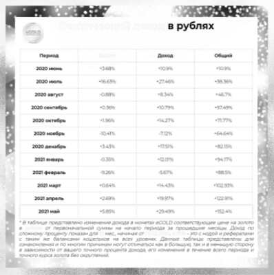 eGOLD - cтейблкоин . Стоимость монеты равна 0.00001 тройской унции золота . За МАЙ золото выросло в цене почти на 6%, а с учётом роста монет на кошельке от 4% в месяц, доход получился солидным. Вы сами можете пересчитать доход , введя месяц входа в монету eGOLD на официальном сайте: https://egold.money