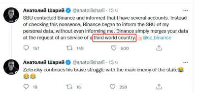 Криптовалютная биржа Binance, как централизованная организация имеет все полномочия для того, чтобы передавать данные пользователям по запросу от силовых и иных государственных структур. В частности, 27 марта об этом сообщил А. Шарий, который считается в Украине российским пропагандистом и подозревается в госизмене. Он указал, что по запросу от СБУ, биржа Binance начала передавать его данные силовому ведомству. Шарий в Твиттере возмутился тем, что криптобиржа Binance передает данные пользователей "стране третьего мира". Между тем, Binance не обязана уведомлять пользователей о запросах контролирующих органов. Шарий имеет украинское гражданство, а значит передача данных украинских спецслужбам правомерна.