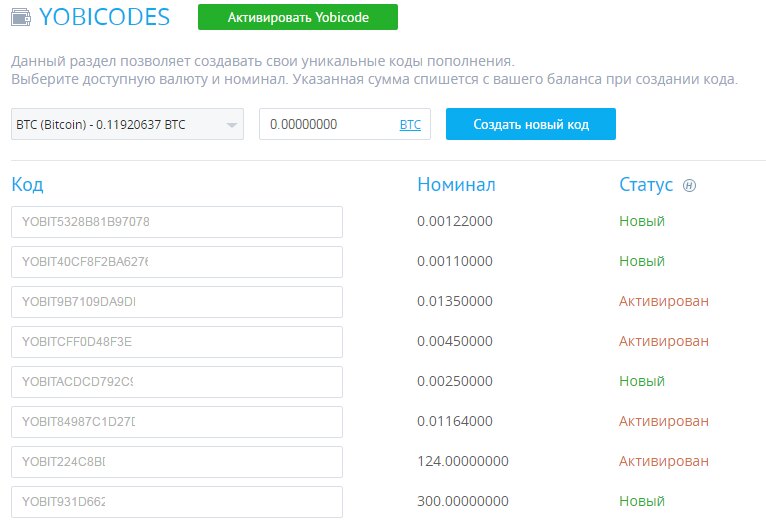 Yobit-код - это код пополнения баланса на криптовалютной бирже Yobit.net. Соответственно, вы можете создать код на нужную сумму в нужной криптовалюте и передать его другому пользователю биржи. Такой способ передачи крипты хорош скоростью и отсутствием комиссии за перевод. Если есть опасения, что yobit-код при передаче будет скомпрометирован, пользуйтесь сервисами секретных заметок. Для того, чтобы создать код, заходим в соответствующий раздел через меню аккаунта. Дальше активируем или создаем код на нужную сумму.