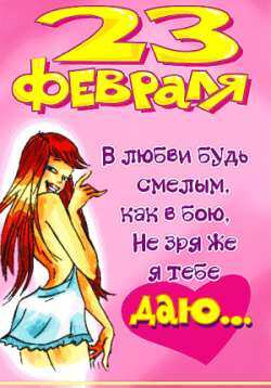Поздравляю с Днём защитника Отечества и хочу пожелать силы, мужества и отваги. Пусть каждый день будет успешным, каждый поступок — достойным, каждая идея — отличной, каждое слово — твёрдым, а каждое действие — уверенным. Желаю быть здоровым, любимым и непобедимым.